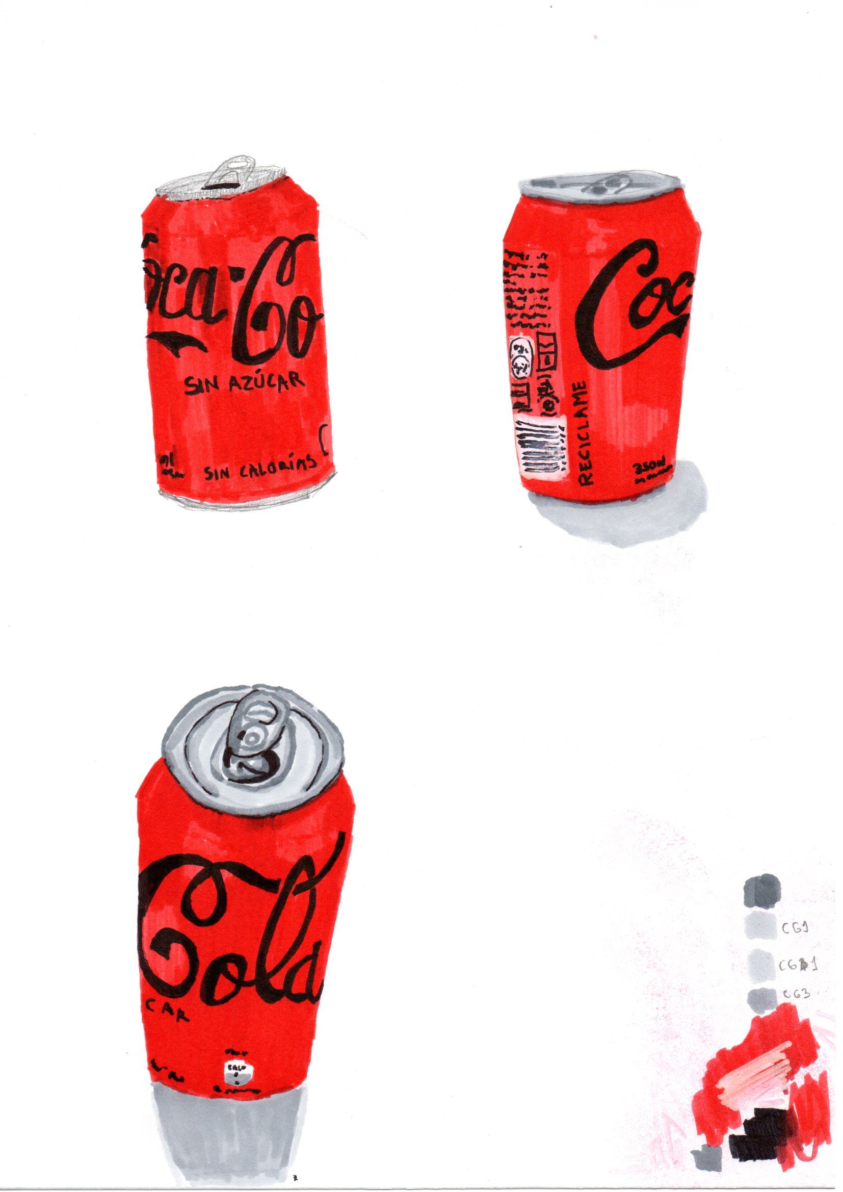 Esta serie de dibujos captura la esencia vibrante y colorida de diversas latas de bebida a través de técnicas vivas con marcadores sobre papel. Cada obra destaca el diseño icónico y los detalles únicos de las latas, transformando objetos cotidianos en arte visualmente atractivo. Los marcadores permiten una exploración rica en color y textura, dando vida a cada lata con un estilo que combina realismo y un toque de abstracción.